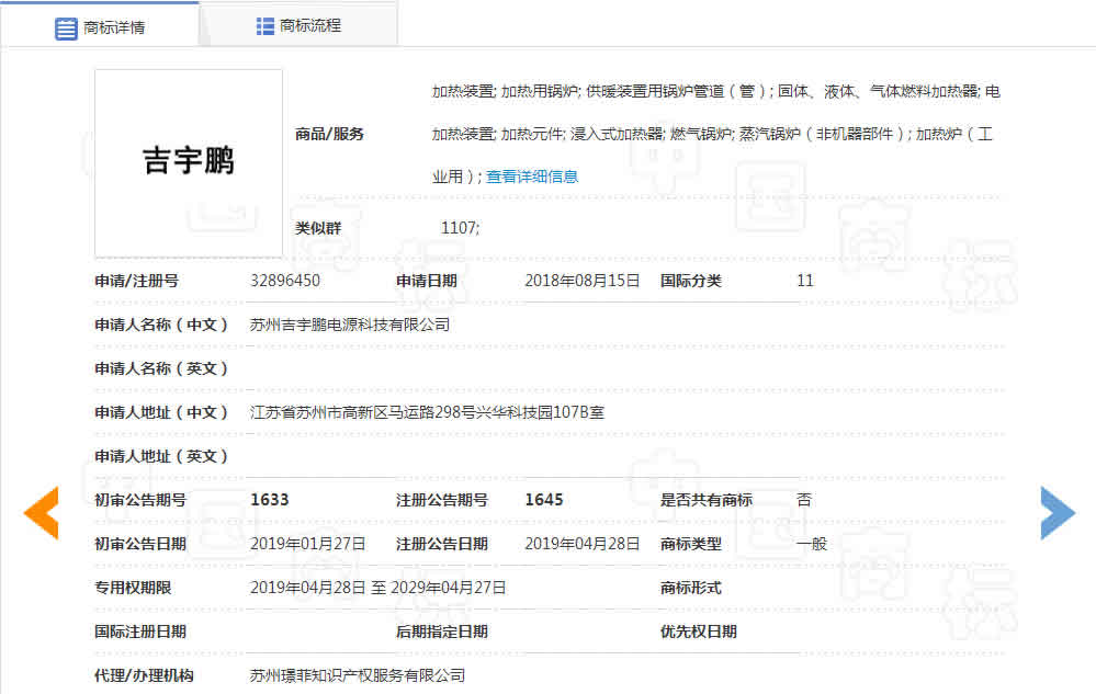 高频感应加热设备品牌JYP和吉宇鹏在商标局查询加热装置; 加热用锅机; 供暖装置用锅机管道(管); 固体、液体、气体燃料加热器; 电加热装置; 加热元件; 浸入式加热器; 燃气锅...