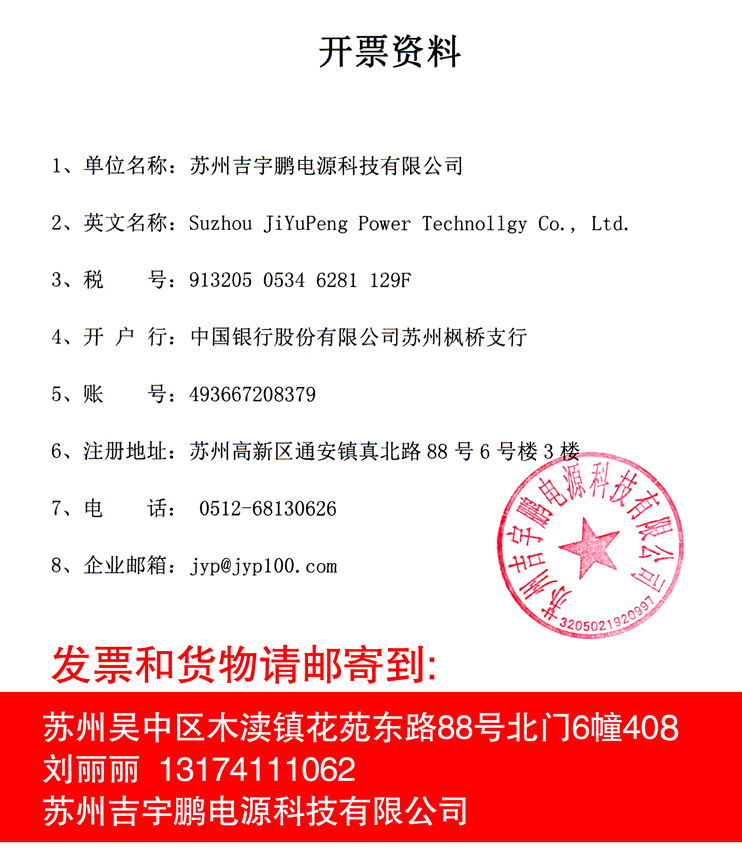 苏州吉宇鹏电源科技有限公司开票资料: 公司名称:苏州吉宇鹏电源科技有限公司 税号: 91320505346281129F 地址电话:苏州高新区马运路298号兴华科技园107B室 开户行帐号:中国银行股份...