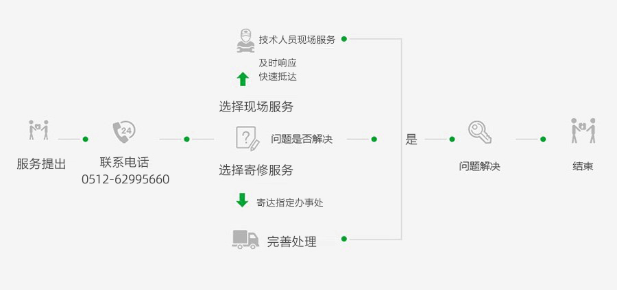 1. 产品在使用过程中有任何的服务需求可拨打吉宇鹏全国统一服务热线(0512-62995660)进行服务申请。 2. 服务工程师接到客户故障报修电话之后,可通过电话沟通指导,给予初步的问题解决方案; 3. 在电话沟通未解决问题的情况下,视情况安排工程师现场服务或通知客户寄到指定维修点进行维修; 4. 客户报修时需提供以下信息:联系人、联系方式、联系地址、所在公司名称、机器型号、故障现象; 5. 问题解决后,有指定跟进人员,对现场机器工作情况进行跟进维护,保障客户生产效率,同时进行服务满意度调查,进一步提升服务质量。